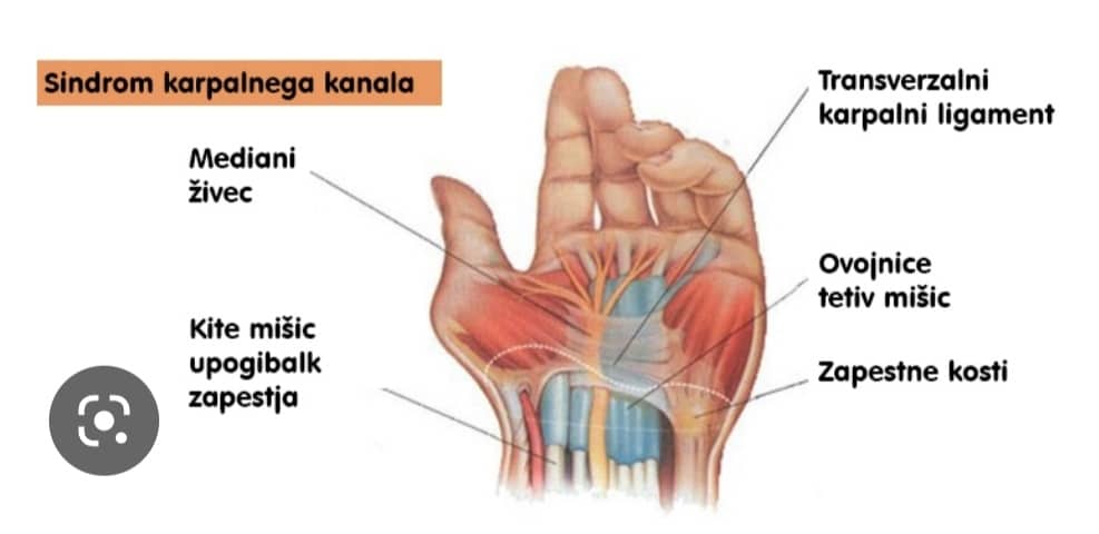 KARPALNI KANAL (nervus medianus) Pri sindromu karpalnega kanala gre za utesnitev medialnega živca, ki se nahaja v tunelu, ki ga tvorijo kosti in čvrsta opna na spodnji strani zapestja.