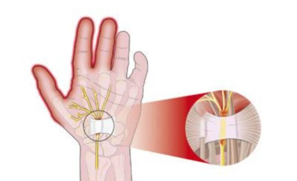 Vsako vnetje kit oziroma kitnih ovojnic, ki ima oteklino, ima posledično potrebo po večjem prostoru, zato stisne zdrava tkiva, ki so okoli njih (medialni živec). Živci so zelo občutljivi na kompresijske sile, zato ne morejo več normalno prenašati živčnih impulzov. Omrtvičenost prstov oživčenih z medialnim živcem je glavna značilnost nevropatskih simptomov sindroma zožitve karpalnega kanala.